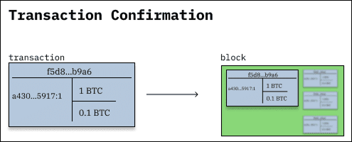 A transaction is confirmed in a block. Due to the risks of block reorganization, River does not consider the transaction to be in a final confirmed state until the confirmed block has a certain depth (e.g. 6 blocks).