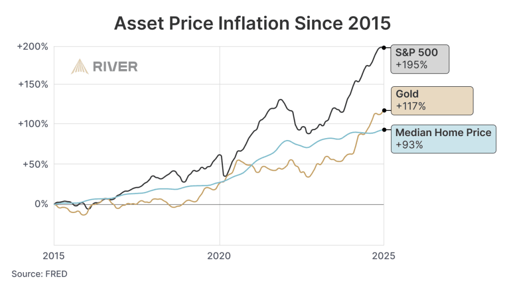 At the same time, everything becomes more expensive. What’s driving house and stock prices isn’t the economy, it’s money printing.