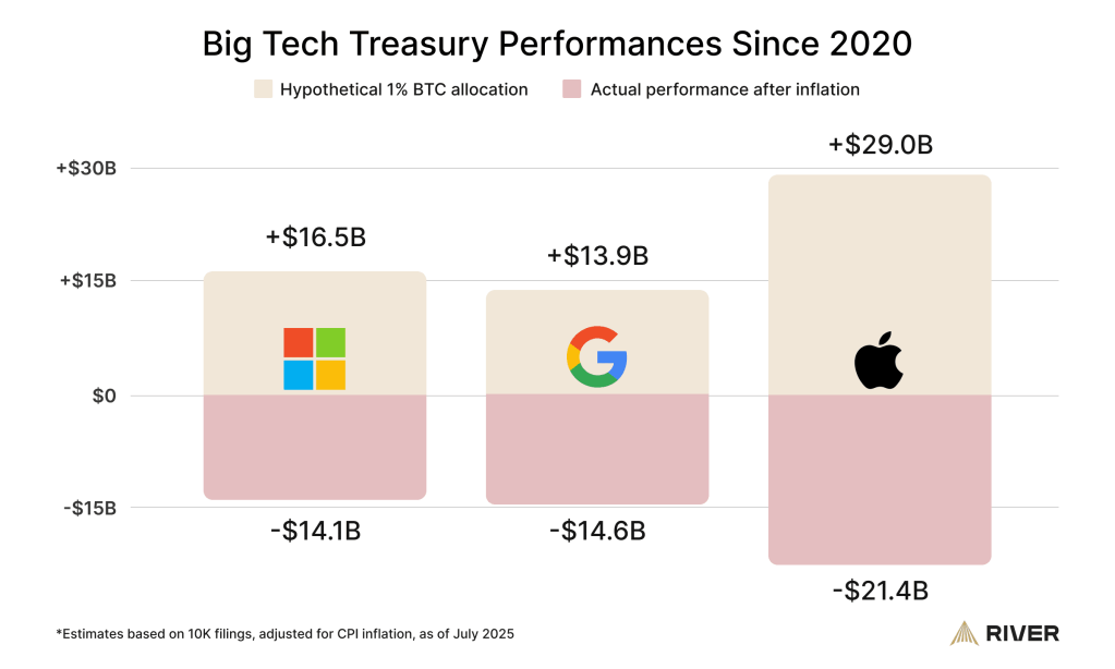 - Inadequacy of conventional assets: Traditional treasury assets such as government bonds and money-market funds have failed to adequately preserve value in the face of inflation. Since 2020, major companies such as Microsoft, Google, and Apple have lost tens of billions in purchasing power by holding these traditional instruments. Had they allocated even 1% of their treasuries to bitcoin in 2020, those losses would have been fully offset.