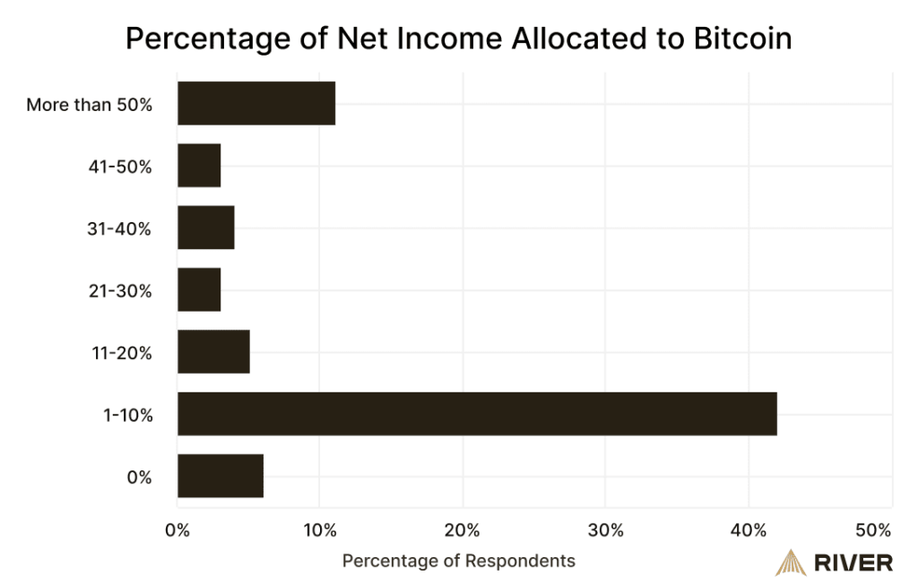 River’s data shows that many businesses are allocating far more than a hypothetical 1% to bitcoin. Businesses using River allocate an average of 22% of their net income, according to a July 2025 survey. The median allocation is 10%.