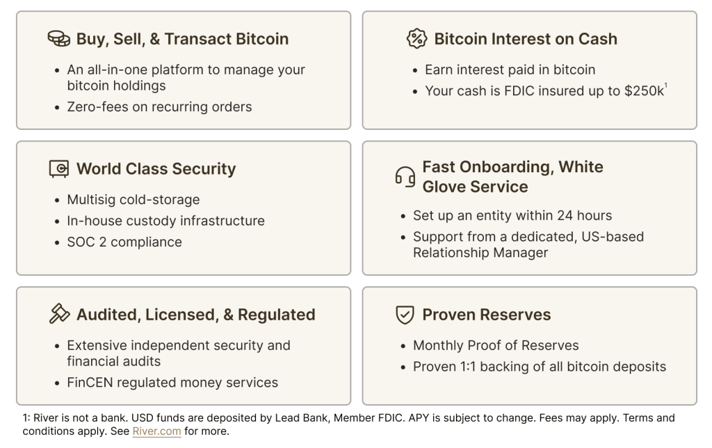 Bitcoin is already delivering value to businesses across every sector of the economy, but overall adoption remains in the early stages. In the future, we believe that every business will hold bitcoin on their balance sheet, while continuing to spend in dollars for the time being. As we enter this Dual Money Era, businesses will demand frictionless movement between bitcoin and US dollars. While US dollars will remain the primary currency for payroll, expenses, and revenue, bitcoin will increasingly become a dominant asset for long-term savings. River is proud to serve our business clients as they transition to this future.