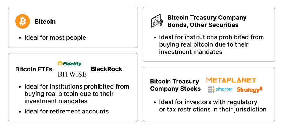 As of August 2025, investors hold over $100 billion worth of stock in bitcoin treasury companies. These investors choose to buy these stocks instead of, or alongside, holding actual bitcoin in the following situations: