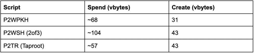 A P2WSH wallet spending 100 inputs with 1 output weighs ~10,479 vbytes, while a P2TR doing the same has a weight of ~ 5779 vbytes. That’s 45% savings, without sacrificing security.