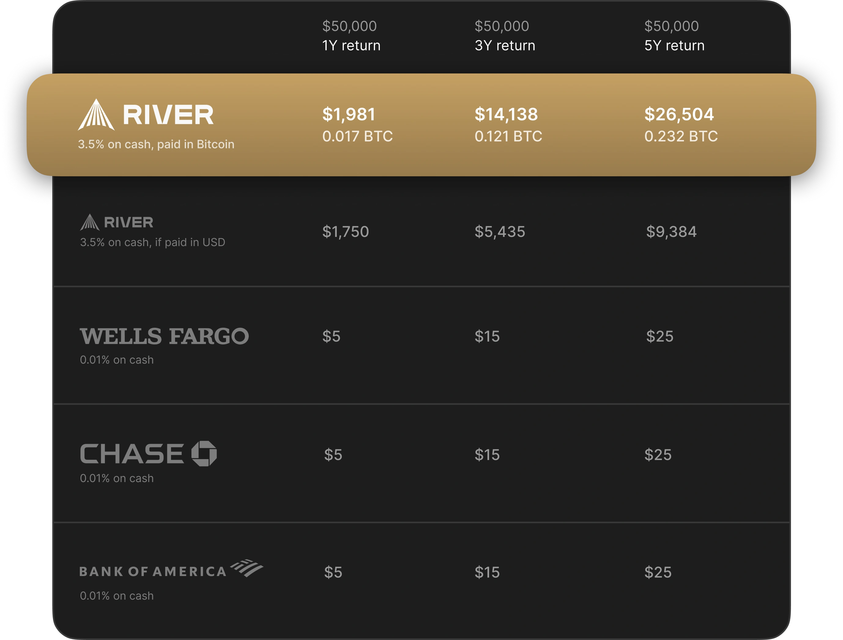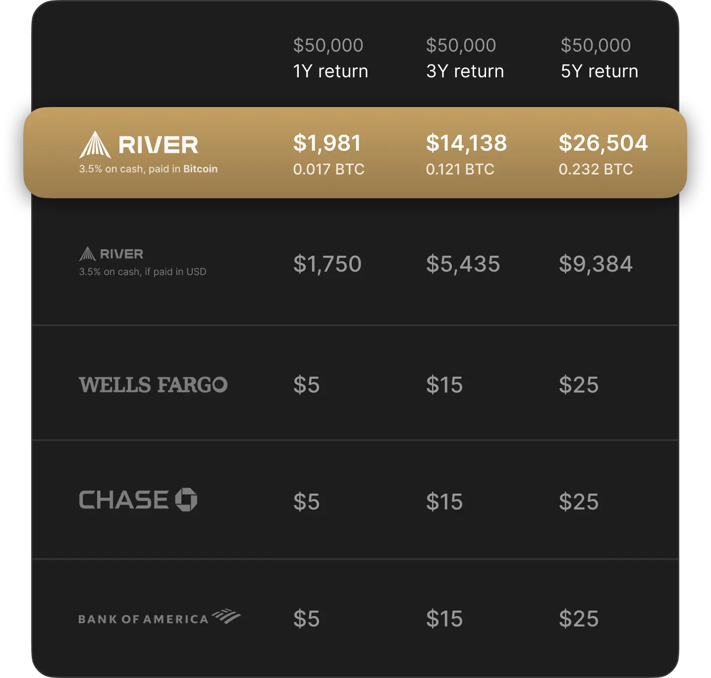 2. The table is for illustrative purposes only. It compares estimated yields and annual earnings calculated from: the yield as of 10/07/2024 of a Bitcoin interest on cash offered in River, and the APY offered by other service providers as found on their websites (data correct as of 10/08/2024 for - Way2Save®, Chase Savings℠, and Bank of America Advantage Savings). Yields will fluctuate over time, and are not a forecast or guarantee of future earnings.