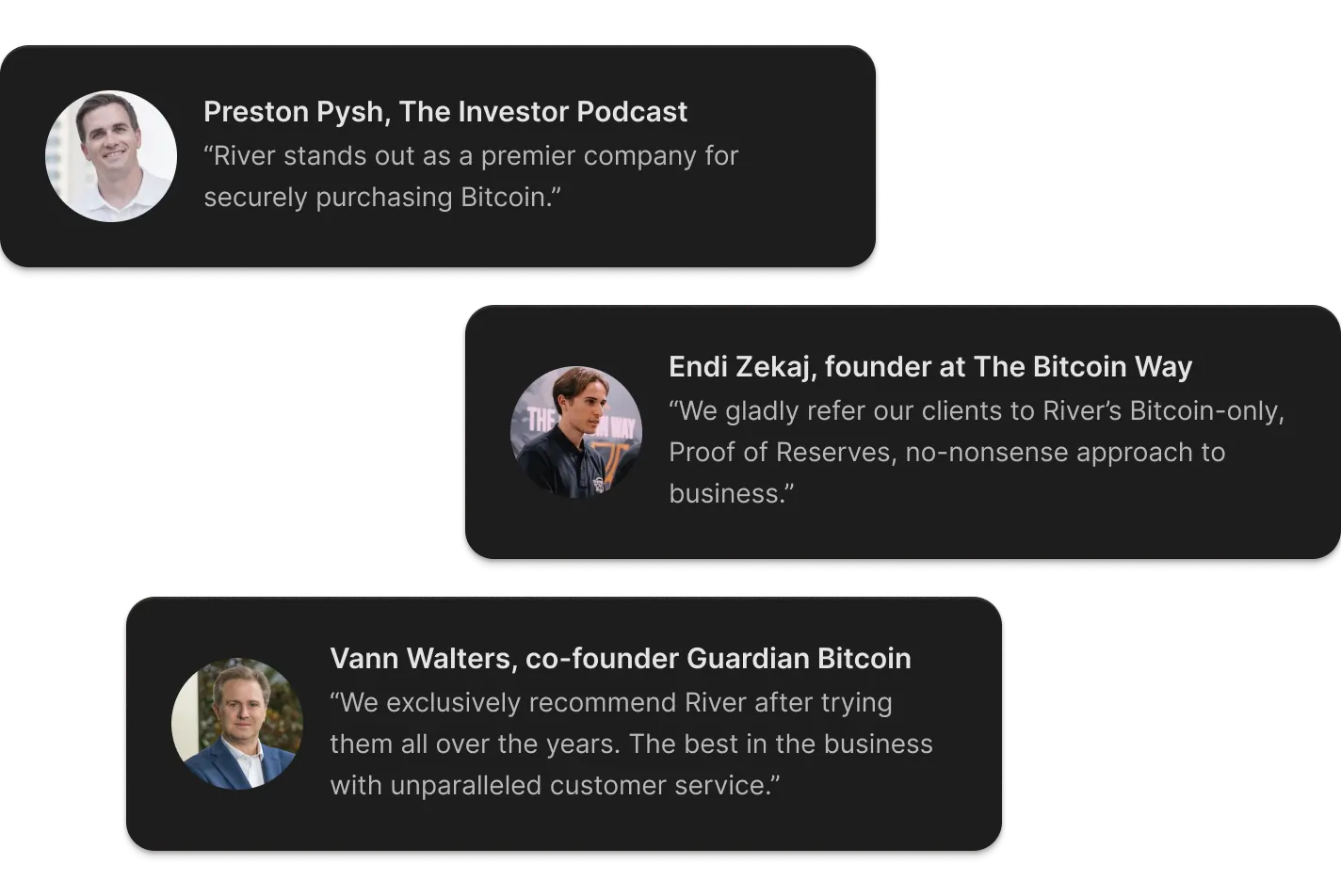 “We gladly refer our clients to River’s Bitcoin-only, Proof of Reserves, no-nonsense approach to business.”